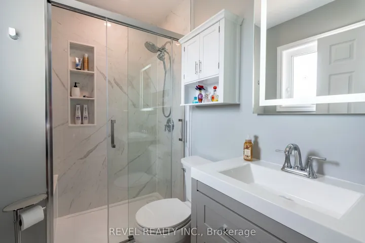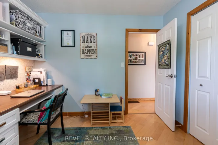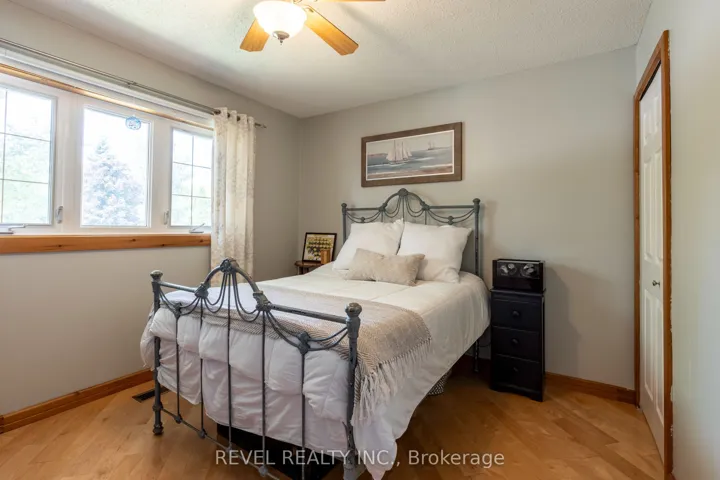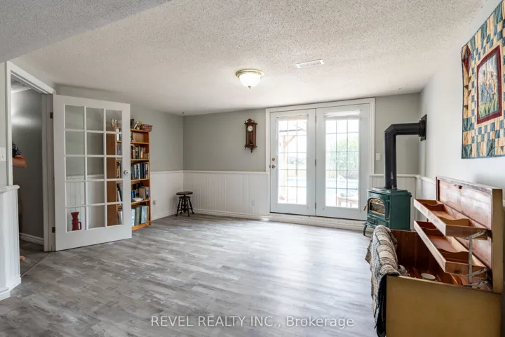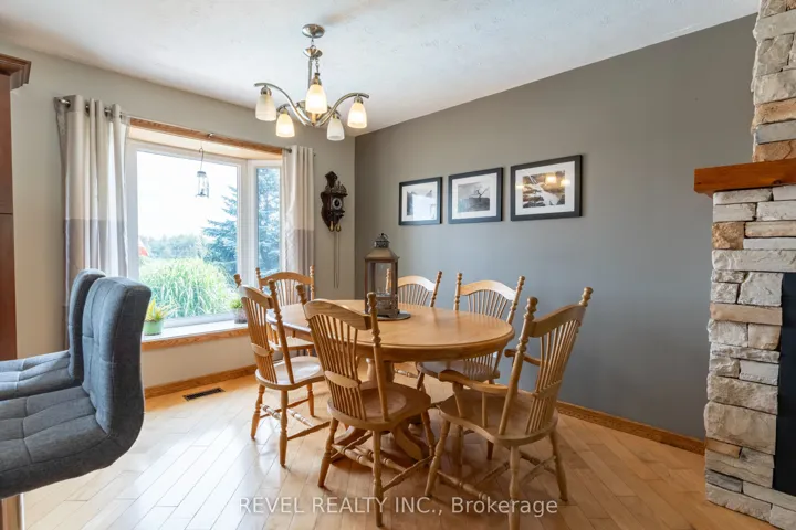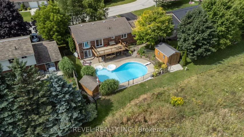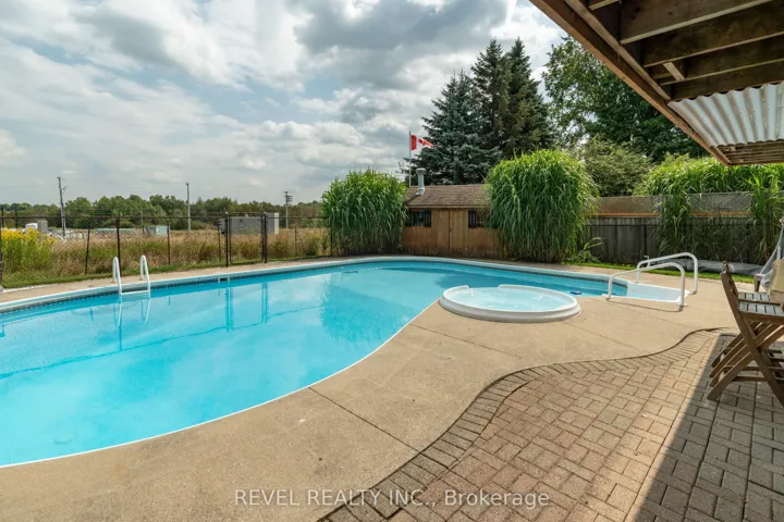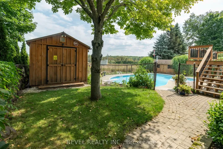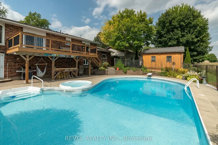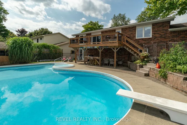 +"PublicRemarks": "This beautifully maintained all brick bungalow is set in one of the area's most sought-after neighbourhoods. The main floor showcases gleaming hardwood floors, a bright and spacious living room with a stone fireplace, and a dining room featuring a large bow window with picturesque countryside views. The kitchen offers a breakfast bar and French doors that open to a 24' x 12' deck, ideal for outdoor dining and entertaining.Three bedrooms complete the main level, including a primary suite with a private en-suite bath. The fully finished lower level provides a fourth bedroom, a combined laundry and 2-piece bath, a versatile hobby or flex room, and a family room with walkout access to the backyard. Outside, enjoy summer living in your private, fully fenced yard with a 38' x 23' heated in-ground pool and 6-person waterfall spa. A perfect home for comfortable family living and effortless entertaining."