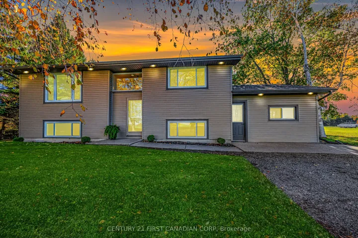 +"PublicRemarks": "COUNTRY LIVING on 1.5 ACRES - AG4 ZONING - GRAND BEND - LOW TAXES! Discover the perfect blend of peaceful country living & modern convenience-just two minutes from Grand Bend's beaches, restaurants & shops. This beautifully updated 4-bedroom+separate office, 2-bath home sits on a private 1.5-acre lot surrounded by a perimeter of mature trees, offering space, privacy & tranquility. Step inside to a bright foyer with soaring two-storey ceilings & an oversized window that fills the space with natural light. The upper level features an inviting open-concept layout with a spacious living area centered around a cozy gas fireplace & large windows showcasing sweeping country views. The kitchen boasts new white countertops, matte black hardware, oversized black stainless sink & a picture window overlooking the deep backyard. The adjoining dining area is perfect for family gatherings or relaxed entertaining. Two comfortable bedrooms, including a generous primary, along with an updated 4-piece bath, complete the main floor. The partially above-grade lower level offers exceptional living space with a large rec room anchored by a gas stove, two more bedrooms, a 3-piece bath & a well-sized laundry area with ample storage. A bonus finished office or studio with a private entrance offers versatility for a home business, gym or guest suite, or could be converted back to a garage. Outside, the expansive 1.5-acre property offers endless possibilities-enjoy peaceful field views, a deep laneway with parking for up to ten vehicles & hookups for both a hot tub & generator. There's also space to build your dream shop, hobby barn or additional outbuildings to suit your lifestyle. Updates include a new heat pump, newer roof & siding, 200 AMP electrical service, sump pump with backup, professionally painted & modern lighting & fixtures-the list goes on. Zoned AG4, bring your horses, goats or chickens & still have room to expand! This property offers the best of both worlds-country & coastal!"