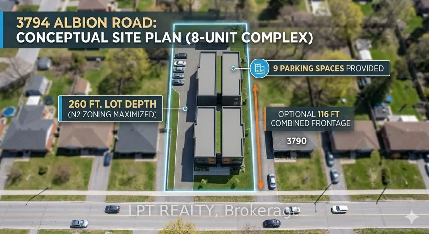 +"PublicRemarks": "Calling all builders! Development opportunity in the south end of Ottawa, minutes from the Hard Rock Casino, the Ottawa International Airport, and South Keys Shopping Mall. The lot size is 58' X 260'. The new N2 zoning will permit a maximum of 6 units. 8-unit potential: While the N2 allows 6 units "as of right", the exceptional 260-foot depth and the new 7.5-meter rear setback cap provide a buildable envelope perfectly suited for an 8-unit multiplex or stacked townhome project via a minor variance. This could be the ideal situation for the new CHMC MLI Select financing program. This property can also be purchased in conjunction with 3790 Albion Road (58' x 260'), allowing for a total footprint of 116' x 260'."