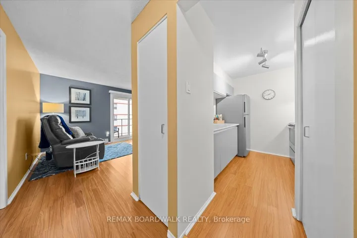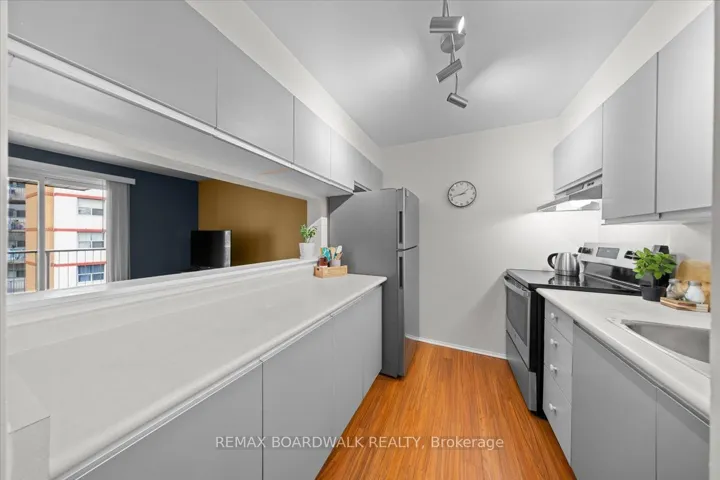 +"PublicRemarks": "Fourth-floor 1-bedroom with a well-laid-out interior, offering in-unit laundry, a walk-in closet, and updated kitchen appliances. Bright living space extends to a covered balcony with room for seating and evening downtime, accessed through a sliding balcony door that enhances indoor-outdoor flow.The kitchen features an extended run of cabinetry offering strong storage, paired with an efficient layout, double sink, modern stainless steel appliances, and a convenient pass-through to the living area.This unit benefits from abundant natural light, including a north-facing vinyl window in the bedroom and well-positioned openings throughout that maintain a bright, comfortable atmosphere.Set within a well-established community with strong walkability and transit access, this location offers a practical lifestyle with everyday essentials close by. The building features extensive amenities including indoor pool, fitness centre, tennis and squash courts, library, and landscaped park areas throughout the complex of Brittany Park. Convenient highway access and a full range of nearby services including grocery stores, banks, pharmacies, personal care services, and many dining options. Parking available for $60/month. HWT (~2024)"