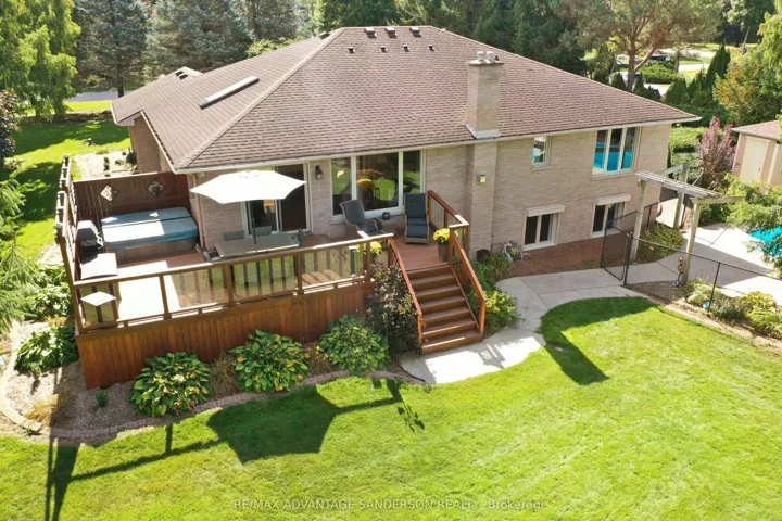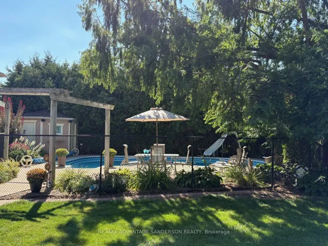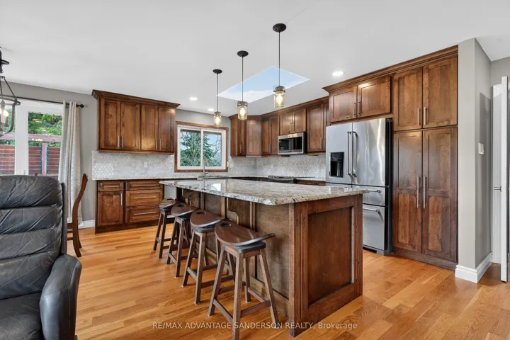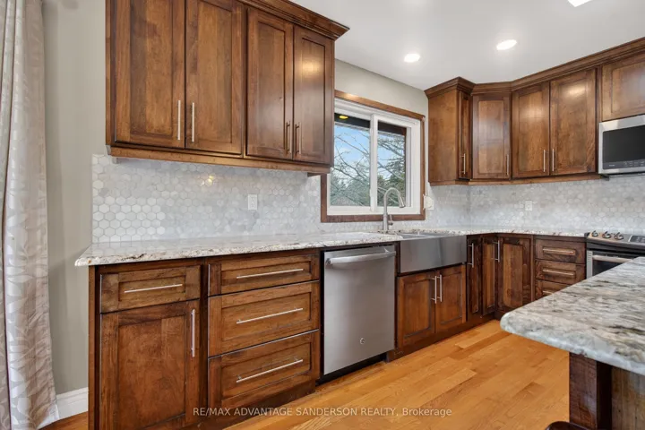 +"PublicRemarks": "Mature park-like lot in the sought after peaceful community of Birr just minutes north London. Experience luxury, privacy, and functionality in one of the area's most desirable settings. This exceptional custom-built brick ranch is situated on a huge country size lot with mature trees and beautiful gardens. 3 spacious bedrooms and 4 bathrooms. Beautiful main floor master suite. Many updates to this home include recently completed luxury master ensuite and custom wormy maple kitchen with granite counters and sit-down island, and extensive storage crafted by a local cabinet maker. Many updates throughout include flooring, windows, baseboards, interior doors, window and door casings and freshly painted floor to ceiling. Large entertainment area in lower level including custom brass rail bar. Dedicated mudroom. Expansive home office and Abundant storage. Outdoor Features include heated inground saltwater pool (22' x 37') and hot tub, no-maintenance composite deck - perfect for entertaining, lawn sprinkler irrigation system, double-wide driveway fits 8+ vehicles, oversized heated double-car attached garage, detached 24' x 24' workshop - ideal for hobbies or storage, European style exterior rolling shutters, cozy firepit surrounded by spacious concrete pad. Updates to shingles, soffit, fascia, and eavestroughs. This home is a rare find - combining tasteful modern upgrades with timeless charm and resort-style backyard. No corners cut in this move in ready home. Whether you're hosting summer pool parties or enjoying peaceful evenings under the trees in your private backyard oasis, this property offers it all!"