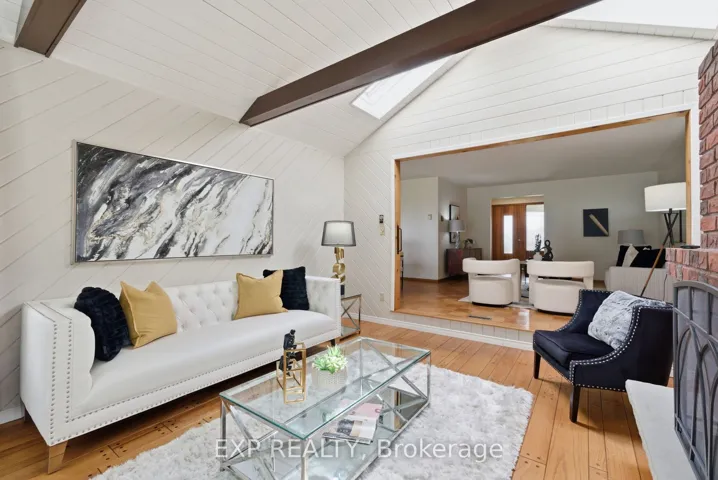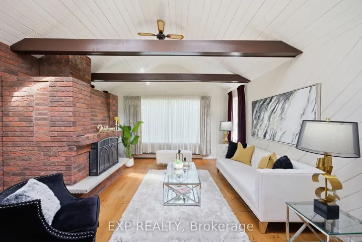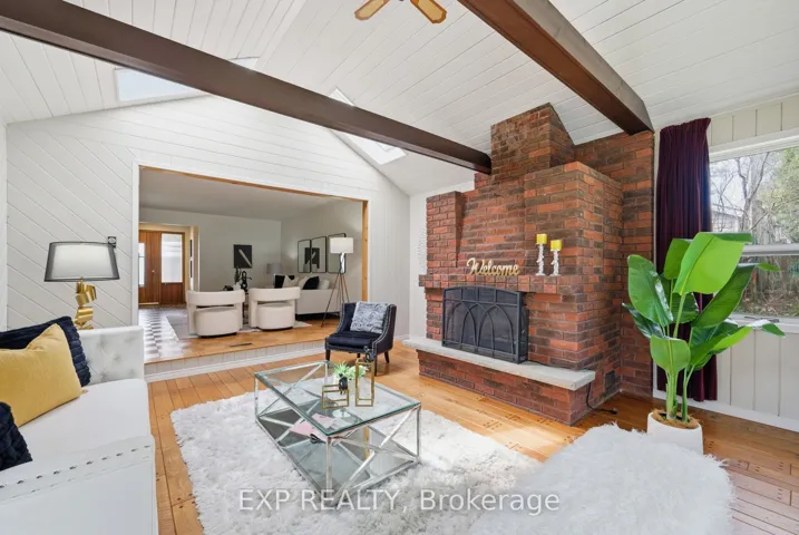 +"PublicRemarks": "Experience the perfect blend of city convenience and natural serenity in this architect-designed mid-century modern bungalow, set on a rare, nearly quarter-acre, park-like lot with an impressive 90-foot frontage-just one block from Ross Memorial Hospital. Offering over 2,000 sq ft of living space, the home features a spectacular sunken family room with oak-plank flooring, soaring cathedral ceilings, skylights, and a dramatic picture window framing lush outdoor views. A distinctive Finnish-designed antique brick fireplace with hearth and cooking arm anchors the space with timeless character. Three spacious bedrooms with original hardwood, elegant L-shaped living and dining areas, and a generous kitchen complete the main level. The finished lower level, with a separate side entrance, offers a large rec room with a fireplace, a cedar-lined sauna with a shower and dressing area, and an added bath-ideal for relaxation or extended living. Outside, enjoy mature landscaping, an interlocking driveway, a private front porch, and a covered breezeway with potential for a second garage."
