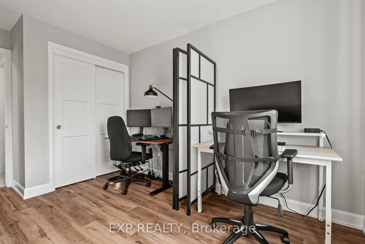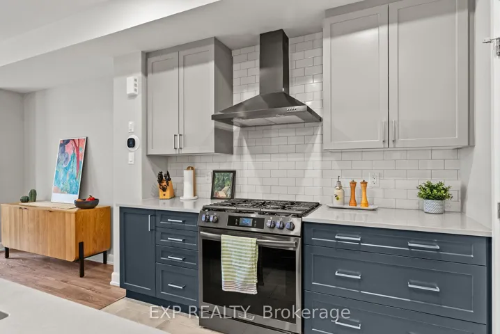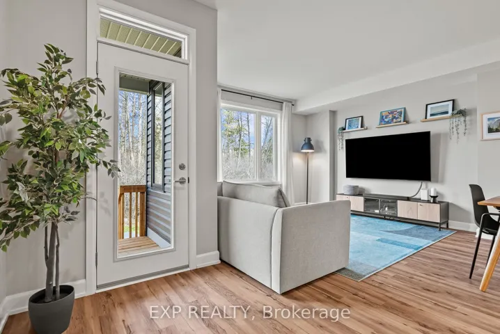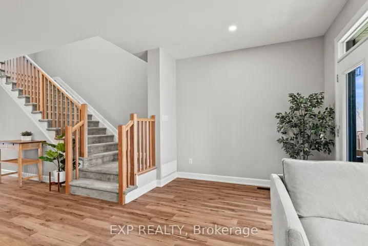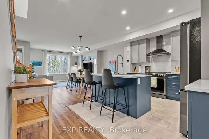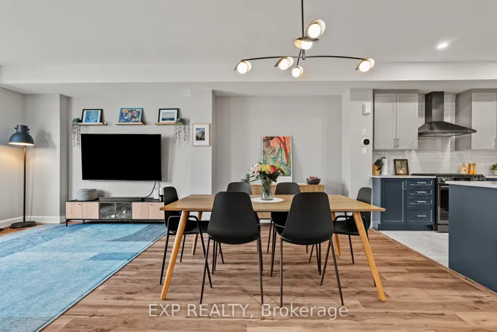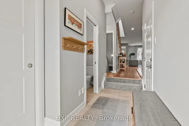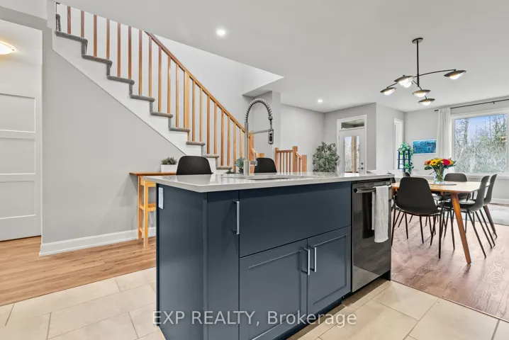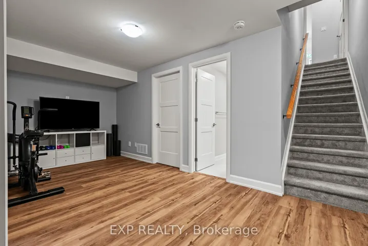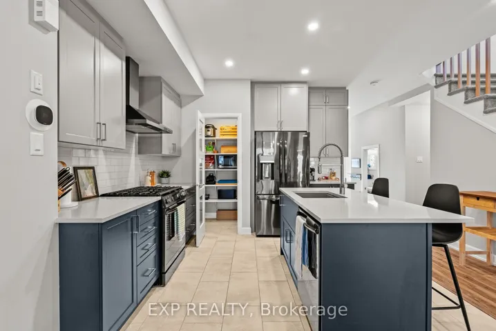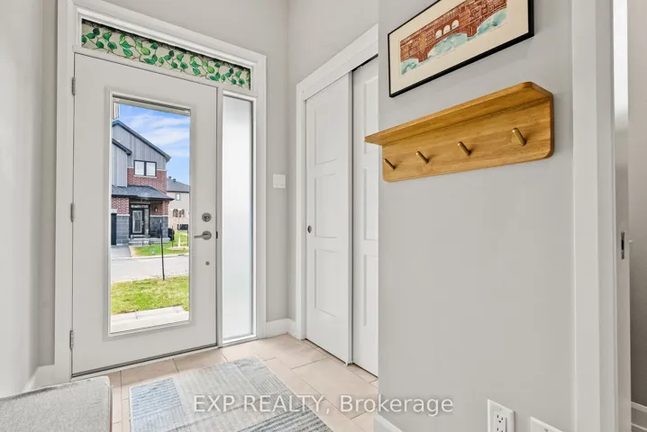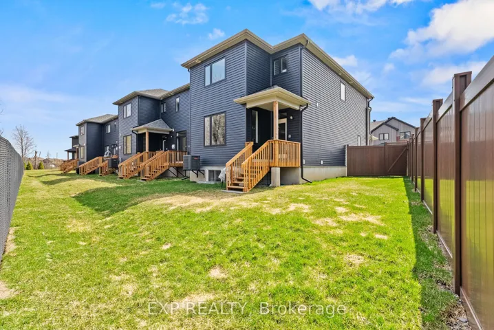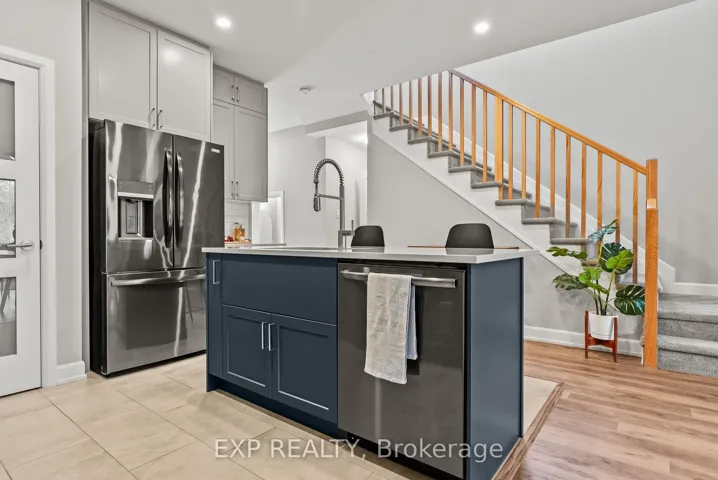 +"PublicRemarks": "Welcome to this beautifully maintained 2022-built end-unit townhome offering exceptional privacy with no rear neighbours and no direct side neighbour. With 3 bedrooms, 2.5 bathrooms, and a finished basement, this home blends modern style with everyday functionality. The thoughtfully designed main level features an open-concept layout ideal for both entertaining and family living. The classic white kitchen is complemented by quartz countertops, black hardware, a spacious island with breakfast bar, and custom built-in pantry cabinetry for added storage and organization. Luxury vinyl flooring runs throughout the main level and continues into the finished basement for a cohesive and contemporary feel. Upstairs, the primary suite offers a relaxing retreat complete with a beautifully designed ensuite featuring a double sink vanity and a custom built-in walk-in closet. Two additional bedrooms, a full main bathroom, and convenient second-floor laundry complete the upper level. The finished basement expands your living space with a comfortable family room and a newly added wet bar-perfect for hosting guests or creating the ultimate movie-night setup. Located within walking distance to shops and restaurants, this home offers the perfect balance of privacy, style, and convenience-simply move in and enjoy."