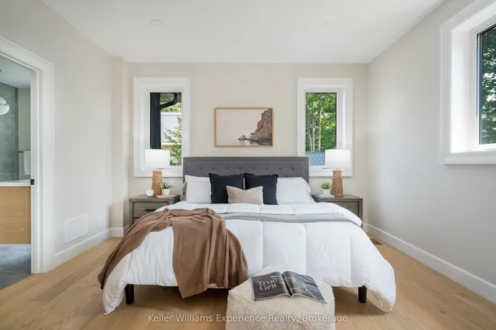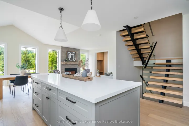 +"PublicRemarks": "Save the HST on this brand-new custom residence (2026 New Housing Rebate included for qualifying Buyers), backed by a comprehensive 7-Year Tarion New Home Warranty. This designer-curated home is nestled within an exclusive enclave of just 12 private residences in the coveted Beaver Valley Woodlands. Crafted for those who measure summer in time outdoors and winter in powder days, this 3,546 sq ft, 5-bedroom, 4-bath modern alpine retreat sits on 1.37 private acres framed by 100 newly planted spruce, pine, and fir. The striking exterior pairs onyx board-and-batten with cedar shake and natural hand-laid stonework for bold, elegant curb appeal. Inside, 13-ft vaulted ceilings and floor-to-ceiling windows flood the great room with light, anchored by a sophisticated porcelain-clad wood-burning fireplace with a reclaimed barn beam mantel--the heart of après: boots kicked off, glasses raised, stories swapped by firelight. Every detail is elevated, from white oak hardwood floors to 8-ft solid poplar doors and trim. The kitchen features full-height custom cabinetry, a quartz island in soft sage, artisan handcrafted tile backsplash with a softly reflective glaze that shifts with the light, and integrated stainless steel appliance. The main-floor primary suite offers a custom walk-in closet and 5-piece ensuite with porcelain tile wall, freestanding soaker tub, glass rainfall shower, and a warm wood vanity with quartz counters. Upstairs, 2 bedrooms--including one with its own fireplace--share a chic 3-piece bath. The lower level continues the home's refined design with a floating glass-and-steel staircase, bright rec room, full gym, 2 bedrooms, and a 4-piece bath. Heated polished concrete floors add warmth throughout. A 19x19 covered porch extends outdoor living, while the heated oversized garage with epoxy floors and waterproof walls is built for every season. 104 Butternut Court is a refined retreat where architectural precision meets the rhythm of everyday life in the valley."