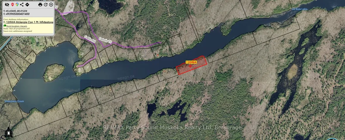 +"PublicRemarks": "Vacant water access cottage lot on De Bois Lake, which is located near Parry Sound. There are some trails on Crown Land leading to the property and it may be possible to hike in from Snakeskin Trail. Nestled adjacent to crown land, this vacant land parcel offers a pristine natural setting perfect for outdoor enthusiasts and adventurers. Size: 750 feet of waterfront, and 4.65 acres., Surroundings: Adjacent to crown land, ensuring privacy and a vast expanse of wilderness, Recreational Opportunities: Ideal for canoeing, kayaking, fishing, and wildlife watching, Natural Beauty: Scenic views of the lake, lush forests, and diverse wildlife habitats, Adventure: Explore nearby canoe routes and embark on thrilling outdoor adventures, Why This Property? Imagine waking up to the gentle lapping of waves on the shore, surrounded by the serenity of nature. Whether you're an avid paddler, a nature lover, or someone looking to disconnect from the hustle and bustle, this property offers endless possibilities. Complete municipal address is 120WA MCKENZIE, Whitestone, Ontario P0A 1G0"