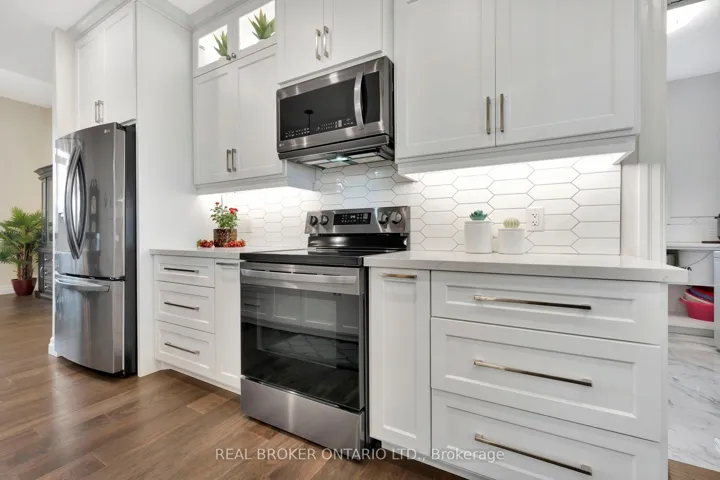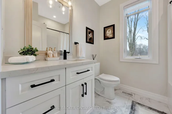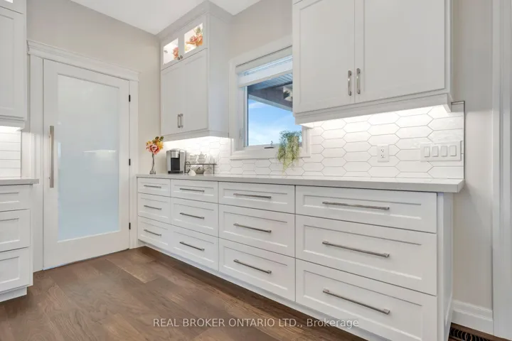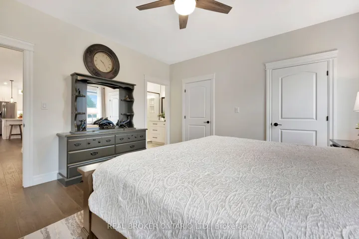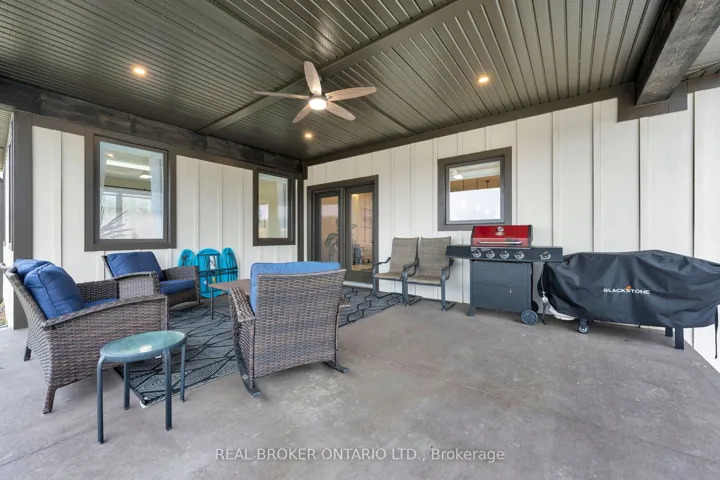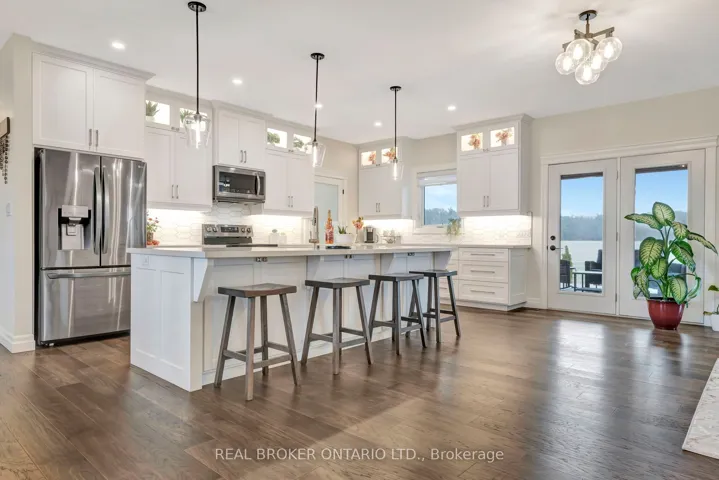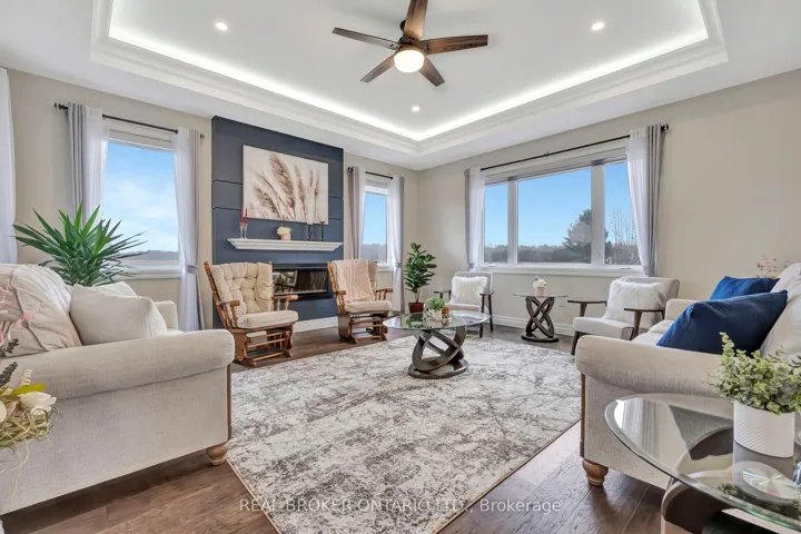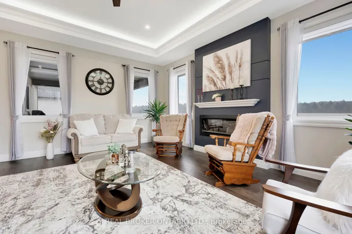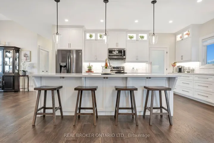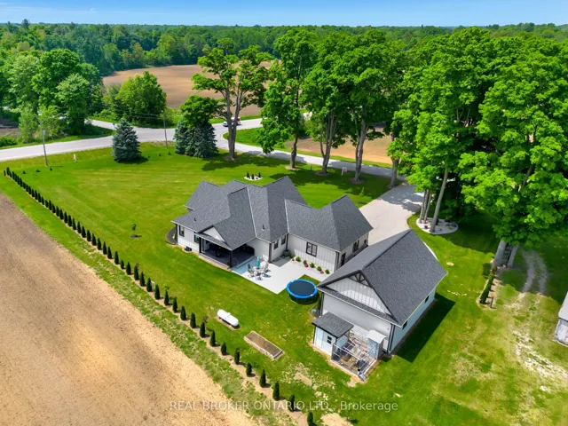 +"PublicRemarks": "Picture yourself coming home to this stunning sprawling bungalow, perfectly situated on 0.91 acres of peaceful, tree-lined property with picturesque views of open fields and a neighboring cash crop backdrop. Step inside and you'll find a home that feels straight out of a magazine, where every detail has been thoughtfully designed. The bright white kitchen is a true showpiece, featuring a large island, quartz countertops, and cabinetry that extends to the height of the elevated ceilings. A spacious walk-in pantry adds both functionality and ample storage. Enjoy seamless indoor-outdoor living with walkout access to a covered porch and lower patio-perfect for entertaining or unwinding while taking in the serene surroundings. Inside, a separate dining room and a sun-filled family room offer the ideal space for gathering, complete with a tray ceiling, recessed lighting, and a cozy gas fireplace. The main floor offers a private primary retreat with a beautifully finished ensuite featuring a tiled glass shower, along with a second bedroom, dedicated office space, and convenient main floor laundry-ideal for today's lifestyle. Downstairs, the partially finished lower level presents endless potential, with a large rec room area, an additional bedroom, and a nearly completed 4-piece bathroom. Outside, the impressive 27x40 detached shop sits on a concrete pad and features 12-foot ceilings, a 10-foot door, and full insulation-perfect for hobbyists, storage, or workspace needs. This property blends peaceful rural living with modern comfort-an exceptional opportunity to own your own private retreat."