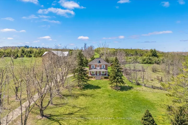 +"PublicRemarks": "Escape to the rolling hills of Mulmur and discover this beautifully preserved three-storey brick farmhouse set on 88 acres of pristine countryside and wonderful private walking trails through pastures and forests. Rich in character and lovingly maintained, the home exudes warmth and timeless charm offering a rare opportunity to embrace the very best of country living. Enter through the welcoming front veranda or opt for the side foyer with direct access from the driveway. The main floor is filled with natural light and features a spacious living room with original wood trim and a cozy wood-burning fireplace, a formal dining room with hardwood floors and tranquil pond views, and an upgraded kitchen with stainless steel appliances. A powder room, full four-piece bath, and laundry room add comfort and convenience. Upstairs, four bright bedrooms share another four-piece bath. The third floor unveils a sunlit open loft with cathedral ceiling, its own bathroom, and endless versatility ideal as a fifth bedroom, home office, art studio, or serene yoga retreat. The natural surroundings are truly exceptional, with sweeping vistas, a spring-fed pond ideal for swimming, and private trails winding through mature forests. Approximately 50,000 trees have been thoughtfully planted, enhancing the property's privacy and year-round appeal. Outdoor highlights include a large classic bank barn, tennis court, and ample open space for recreation or relaxation. A long driveway leads to a circular drive with parking for 15+ vehicles perfect for hosting gatherings. Tucked away on a quiet country road with breathtaking views and unmatched seclusion, this exceptional property is just minutes from Mansfield Ski Club, Mono Cliffs Provincial Park, the Bruce Trail, 20 minutes to Mad River Golf, Devil's Glen ski and the charming village of Creemore."