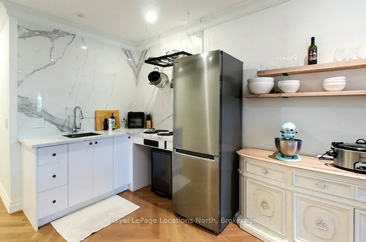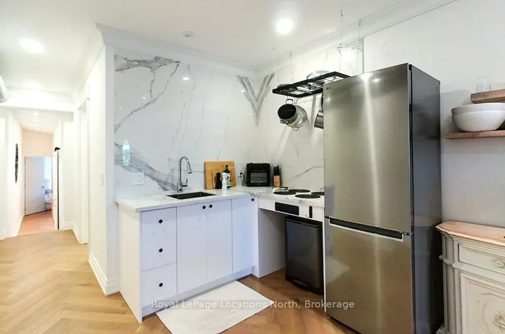 +"PublicRemarks": "Renovated loft style apartment on the main street in trendy downtown Meaford with fantastic commercial unit below, rent it out or operate your own business. The stunning, one bedroom, plus den apartment features an open loft feel, high ceilings, skylights, cinematic lighting, pot lights, white oak engineered hardwood floors, Gorenje ventless washer/dryer, sound proof insulation, four piece bathroom with heated floors, new windows and kitchen with porcelain counters/feature wall and INVISA Cook Top! With the addition of a window, the den could be converted to a second bedroom. The list of upgrades to the apartment is impressive! Private parking for two vehicles at rear of building is a real bonus. The main floor retail/commercial unit is well designed for a variety of uses with neutral decor, high ceilings, gallery lighting, front and back entrances, updated electrical, storage, two-piece washroom, commercial sink and access to basement. Exposure on the main street and customer street parking is a great perk for any business. Some commercial uses include: Art Studio, Retail, Fitness Center, Business/Medical Office, Restaurant (Buyer to perform their due diligence for desired use). Separate hydro meters."