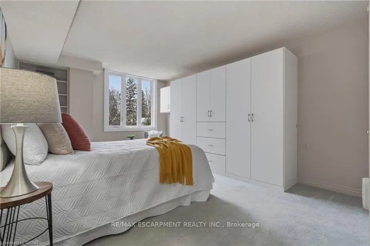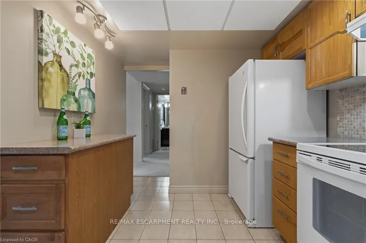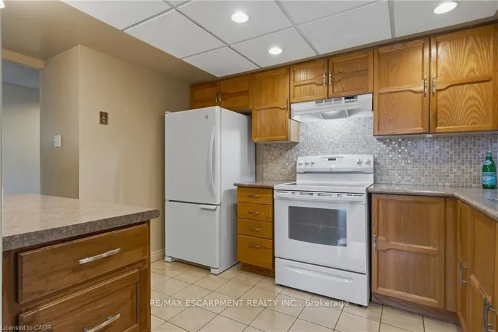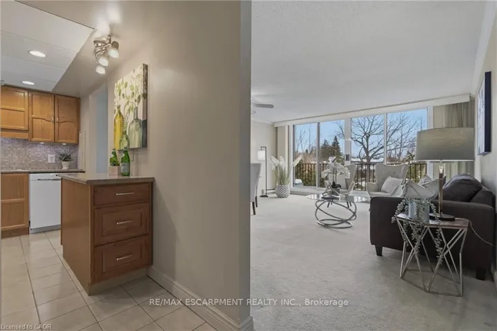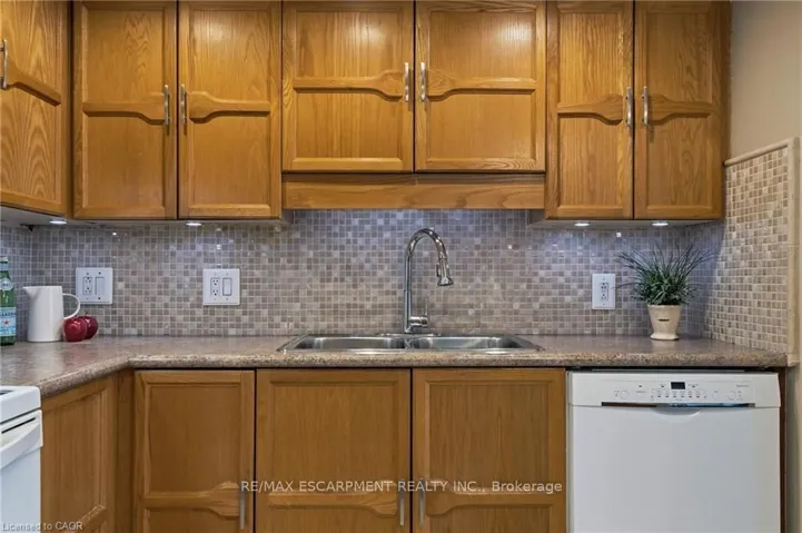 +"PublicRemarks": "Rarely offered, immaculate one-bedroom suite featuring an updated bathroom with granite countertop and a refreshed oak kitchen complete with backsplash, additional storage cabinetry, under-cabinet lighting, pot lights, double sink, built-in dishwasher, fridge, and stove. Convenient in-suite laundry with stackable washer and dryer plus extra storage. The spacious open-concept living and dining area is filled with natural light and offers a walk-out through oversized patio doors to a generous balcony overlooking mature trees and beautifully manicured grounds. The large principal bedroom features a picture window with views of the front gardens and a walk-in closet. This Senior friendly Condo. includes one underground parking space and a locker, and lots of storage. Ideally located close to shopping, restaurants, easy access to the 403, scenic hiking trails, Oak Gables Golf & Country Club, Hamilton Golf & Country Club, and numerous parks. Don't miss this opportunity! WOW!"