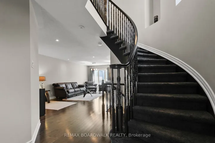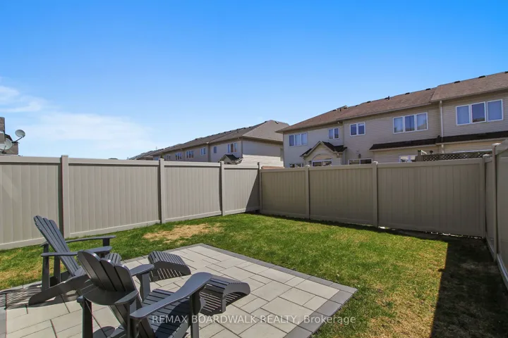 +"PublicRemarks": "Welcome to this fully fenced, private end-unit townhome in the family-friendly community of Barrhaven. Situated on a good-sized lot with no right of way, this original owner, executive 3-bedroom, 3-bath residence offers many upgrades and thoughtful details throughout.The upgraded front door welcomes you inside to gleaming hardwood floors spanning the main level. The spacious living and dining area is bright and sunny, featuring a large window and an inviting open concept design with an elegant circular staircase. The eat-in kitchen is a chef's delight with crown molding, a designer backsplash, ample cabinetry, and a large island with double sinks and a dishwasher. Completing the main floor is a convenient guest bathroom.Upstairs, the primary bedroom is a peaceful retreat with a generous walk-in closet and a four-piece ensuite bathroom including a separate shower and relaxing soaker tub. Two additional good-sized bedrooms and another four-piece bathroom with a linen closet complete the upper level.The professionally finished lower level is bright and spacious, with a gas fireplace and upgraded flooring enhancing the large recreation room. A combined utility and laundry area plus a separate storage space add extra functionality.Additional features include fresh paint in 2026, central air conditioning, custom blinds, and an extended driveway allowing side-by-side parking. Both front and back yards boast custom interlock, perfect for outdoor enjoyment.This executive home combines comfort, style, and practicality in a sought-after neighborhood. Don't miss this opportunity! Property taxes to be verified."