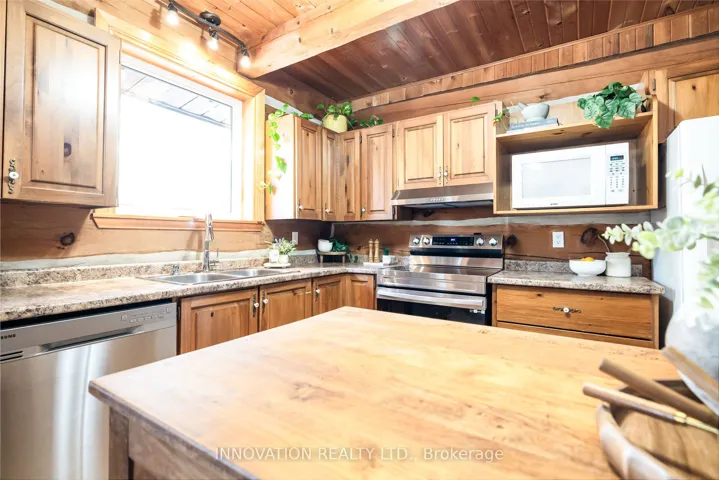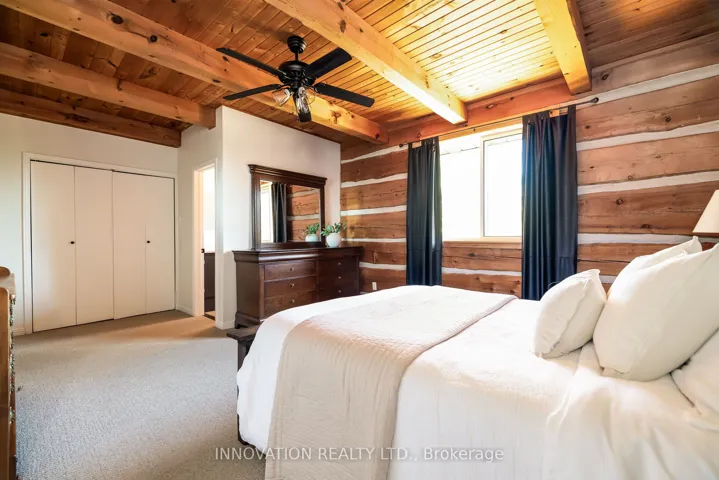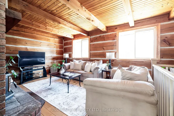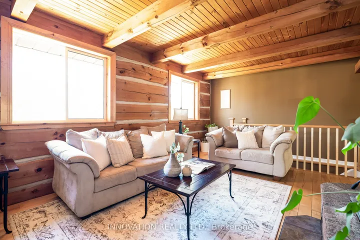 +"PublicRemarks": "Welcome to Prestigious Barlow Crescent in Dunrobin Shores. Set on a scenic stretch with views of the Gatineau Hills and the Ottawa River, this distinct log home combines rustic charm with unforgettable curb appeal.Black-trimmed windows frame the exterior beautifully, while a full-length front deck invites you to take in the peaceful surroundings. Step inside to a spacious foyer with oversized pine doors that make a striking first impression.The open-concept kitchen and dining area feature warm hardwood flooring that flows seamlessly into the living space-anchored by an airtight wood-burning fireplace, perfect for cozy evenings.The generous primary bedroom includes a private 2-piece ensuite, while a second bedroom overlooks the beautifully treed backyard. A large family bathroom also offers the convenience of an integrated laundry area.The lower level adds valuable flex space great for a home office, a gym, or additional living area-along with inside entry from the garage and access to the abundant raised crawl space storage.Out back, enjoy a spacious south-facing deck, private yard, and firepit-ideal for entertaining or unwinding outdoors.This one-of-a-kind home offers a rare blend of comfort, character, and natural surroundings in one of Ottawa's most sought-after waterfront communities."