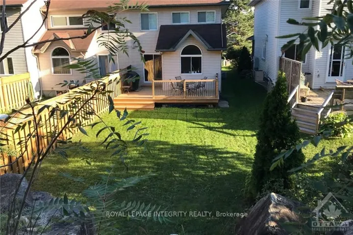 +"PublicRemarks": "Welcome Home to 106 Blackdome Crescent, a rare End-unit townhome in desirable Kanata Lakes backing onto greenspace and forested trails with no rear neighbours. This private setting offers direct access to walking paths leading to a large park. The main floor features a bright open-concept layout with a spacious kitchen, complete with granite countertops, large island, pantry, stainless steel appliances, and updated microwave hood fan. The living and dining areas flow perfectly, ideal for everyday living and entertaining. The second level offers 3 bedrooms and a full bathroom, with hardwood flooring throughout and large windows brining in great light. The fully finished basement provides additional living space, perfect for a family room, office, or recreation area plus plenty of storage. Enjoy the fully fenced backyard with a large deck, backing onto mature trees for added privacy and No Rear neighbors to look at but beautiful greenery. Updates include: furnace (2014), roof (2015), A/C (2022). Furnace and A/C serviced annually .Attached garage with inside entry and driveway parking. Very low traffic street and conveniently located close to top-rated schools, parks, transit, and all amenities. Book your showing today and enjoy summer nights in this backyard this summer!"