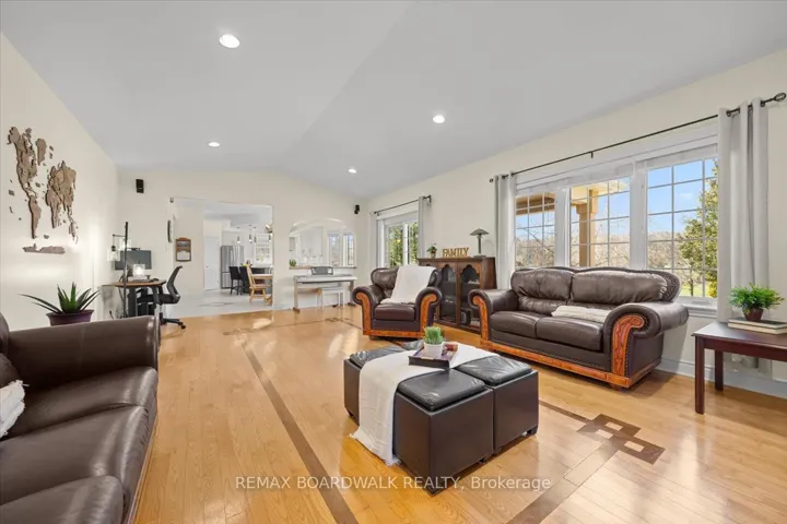 +"PublicRemarks": "Purpose-built multi-generational residence on a private 1.1-acre lot just outside the village of Cumberland, designed w/two independent living spaces & separate entrances. Exterior features include a stucco façade, patterned concrete walkways, circular paved driveway, & multiple garages. Shared foyer w/tile flooring, 11' ceilings, architectural cut-outs, glass block inlays, & recessed lighting provides access to both dwellings. Main residence offers 3+1 bedrooms and 3.5 bathrooms w/9' ceilings, hardwood flooring, & high baseboards throughout. Main floor den with coffered ceilings, panoramic window, & French glass doors. Kitchen is centred around a sculpted centre island w/granite countertops, two-tone soft close shaker cabinetry, secondary prep sink, pot drawers, valence lighting, fluted hood fan, glass accent cabinets, & family-sized walk-in pantry. Dining area w/tile flooring & radiant heat connects to a family room w/cathedral ceilings, corner windows, & gas fireplace. Main floor includes laundry & powder room w/ glass top vessel sink. Upper level features a primary suite w/bay window, walk-in closet, & 4-piece ensuite w/double vanity & glass shower. Two additional bedrooms & a 4-piece main bath complete the level. Finished lower level includes Rec room, an additional bedroom, 3-piece bath, workshop, & mechanical/storage areas, plus access to the secondary dwelling. Sun-filled secondary bungalow-style residence features wide hallways, hardwood flooring, & accessible design. Main level includes primary bedroom w/walk-in closet & 4-piece ensuite, additional 3-piece bath w/walk-in shower & laundry. Open kitchen w/transom windows & breakfast bar, bright dining area, & living room w/gas fireplace & patio door to private deck. Lower level offers Rec room w/soundproof ceiling, second bedroom, den, & full bath. Both dwellings have their own rear covered composite decks overlooking private grounds. Ideal for multi-generational living w/independent yet connected spaces."